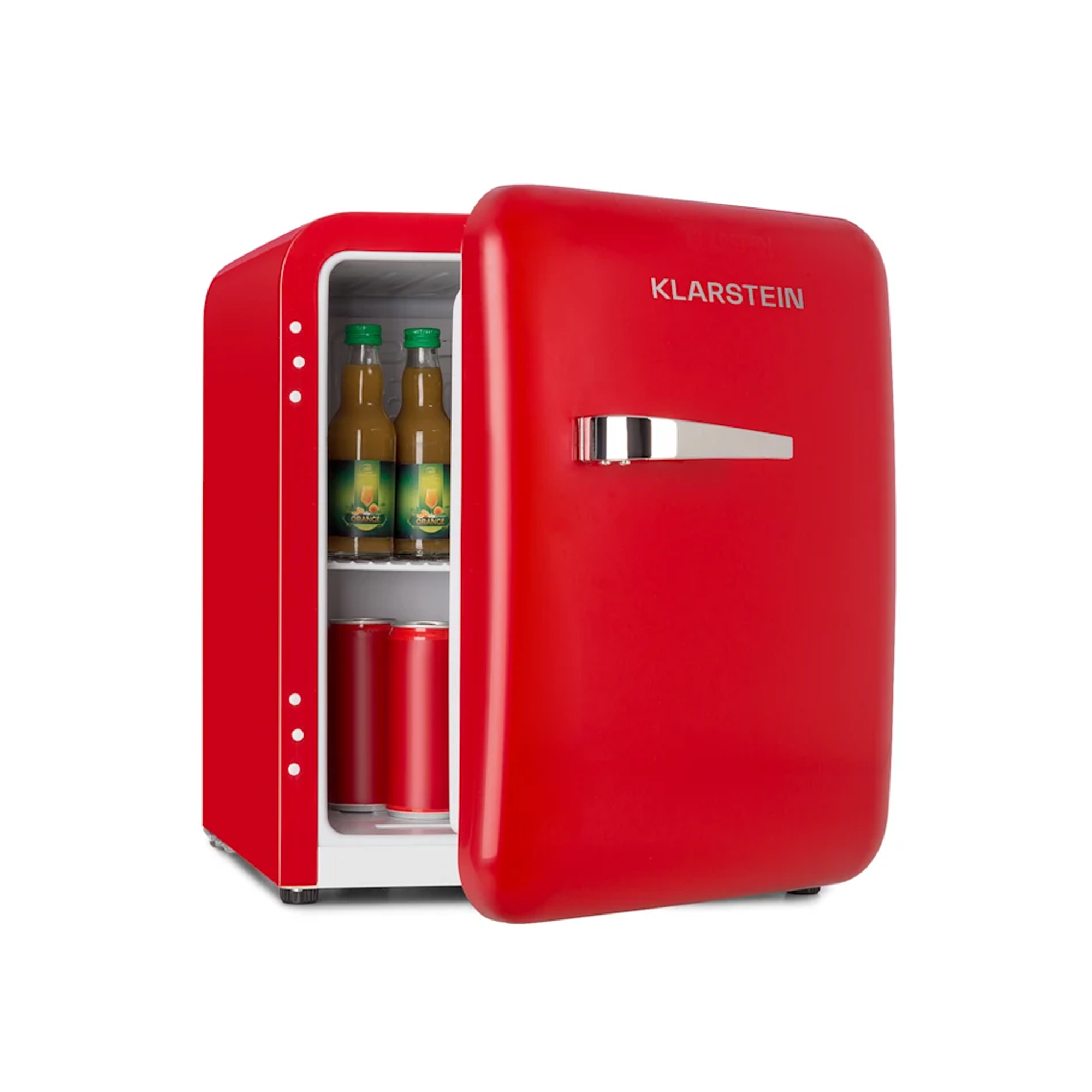 Klarstein Audrey Mini Retro 48L ghi điểm tuyệt đối với thiết kế nhỏ gọn nhưng đầy phong cách, lý tưởng cho những không gian sống hiện đại như phòng ngủ, văn phòng cá nhân, studio hay căn hộ mini. Lấy cảm hứng từ thập niên 50, tủ lạnh khoác lên mình diện mạo retro cổ điển với màu đỏ nổi bật, đường cong mềm mại và tay cầm mạ chrome sang trọng, tạo cảm giác hoài niệm nhưng vẫn rất thời thượng.