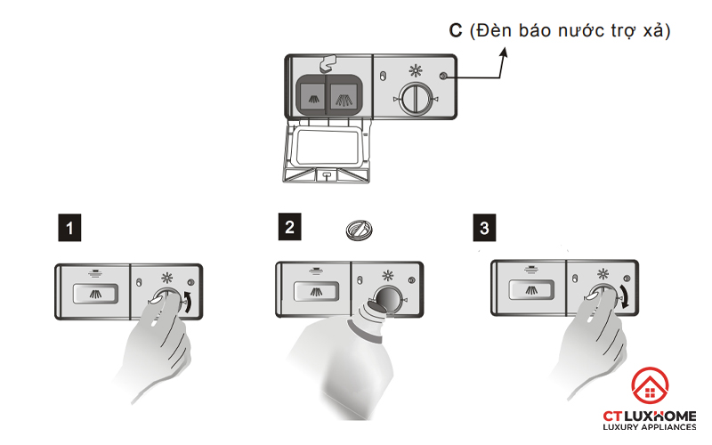 - Đèn báo nước trợ xả: Đèn sẽ sáng lên khi máy cần bổ sung thêm nước trợ xả (nước bóng).