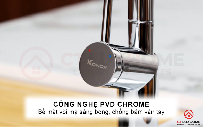 Bề mặt vòi rửa chén rút dây Konox Neva áp dụng công nghệ PVD Chrome. Tạo bề mặt vòi rửa sáng bóng, khả năng chống bám vân tay hiệu quả. Thuận lợi trong việc lau chùi, vệ sinh vòi rửa.